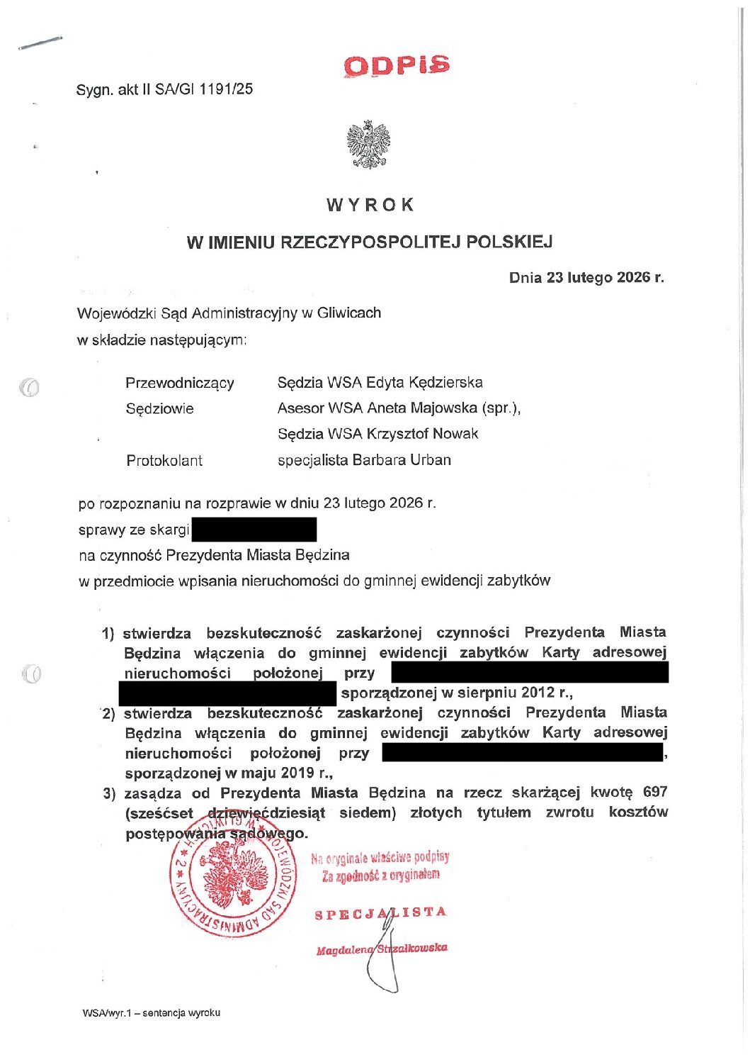 Wojewódzki Sąd Administracyjny w Gliwicach stwierdził bezskuteczność czynności Prezydenta Miasta Będzin. Nasza kancelaria z sukcesem doprowadziła do wykreślenia nieruchomości naszej Klientki z Gminnej Ewidencji Zabytków. To rozstrzygnięcie potwierdza, że organy gminy nie mogą arbitralnie ograniczać prawa własności bez zapewnienia właścicielowi realnej ochrony prawnej.