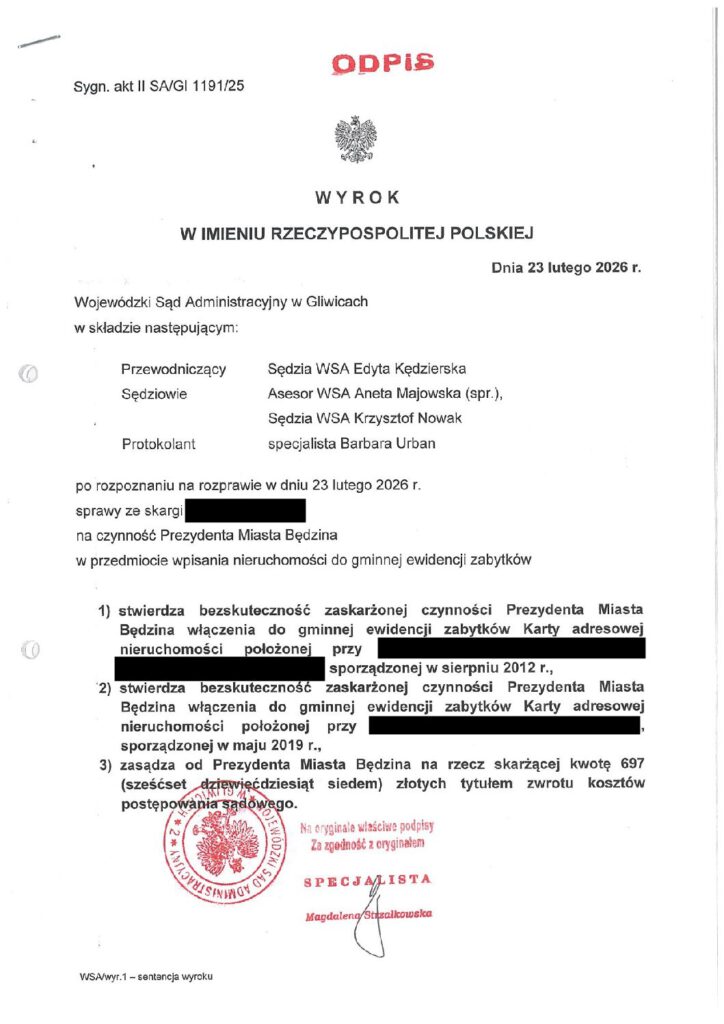 Wojewódzki Sąd Administracyjny w Gliwicach stwierdził bezskuteczność czynności Prezydenta Miasta Będzin. Nasza kancelaria z sukcesem...